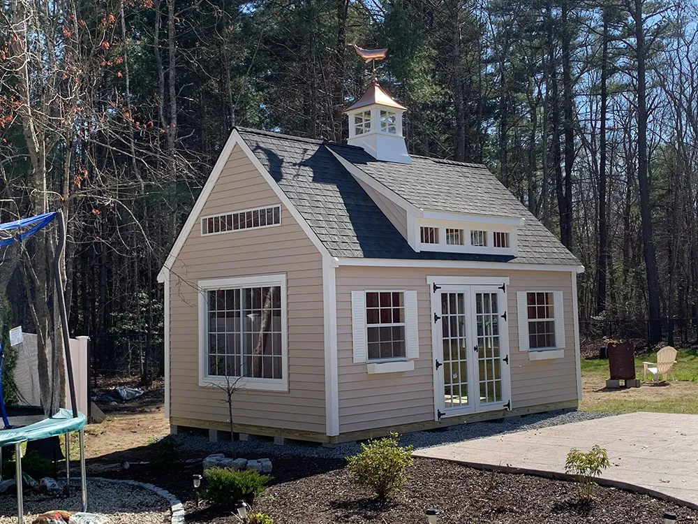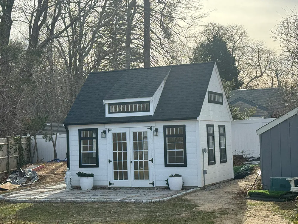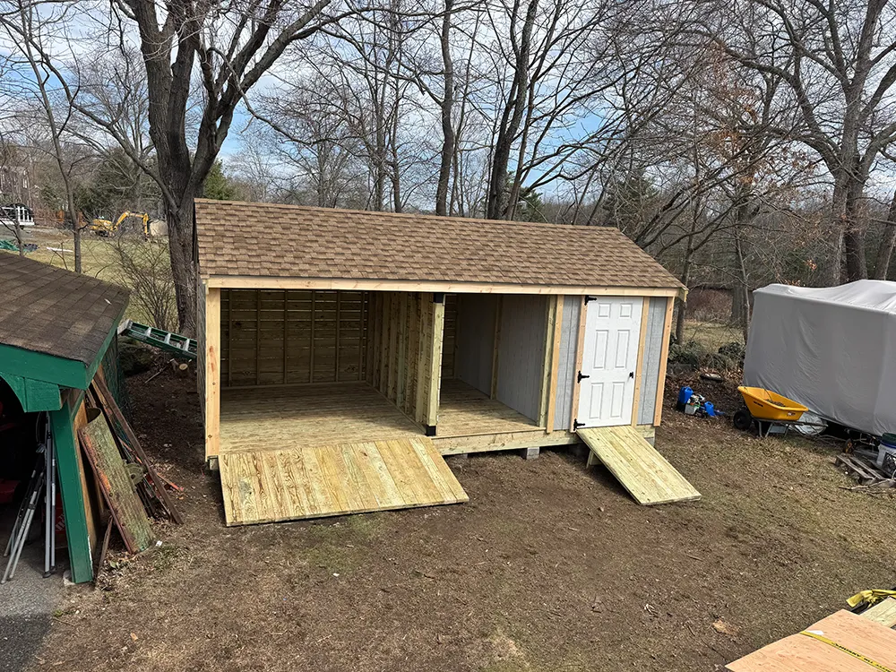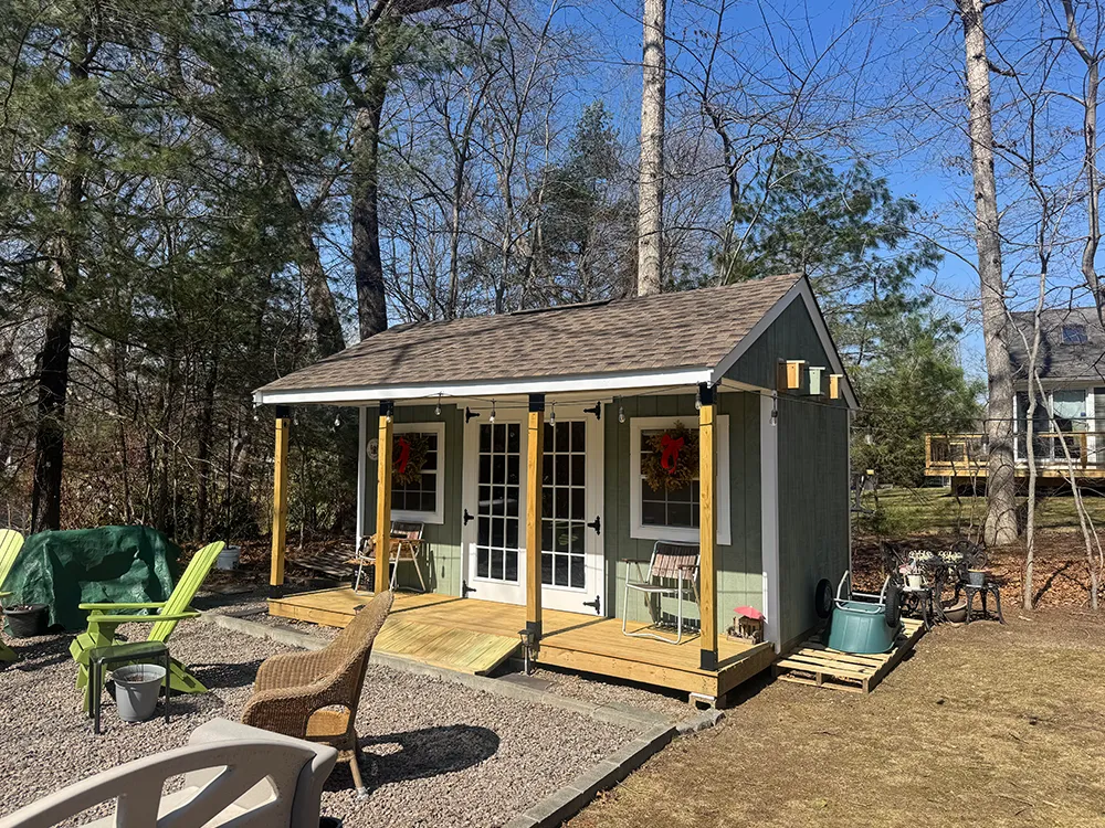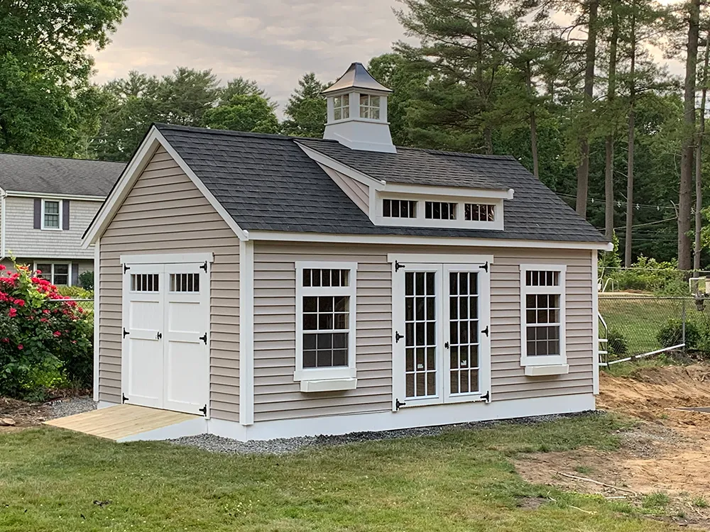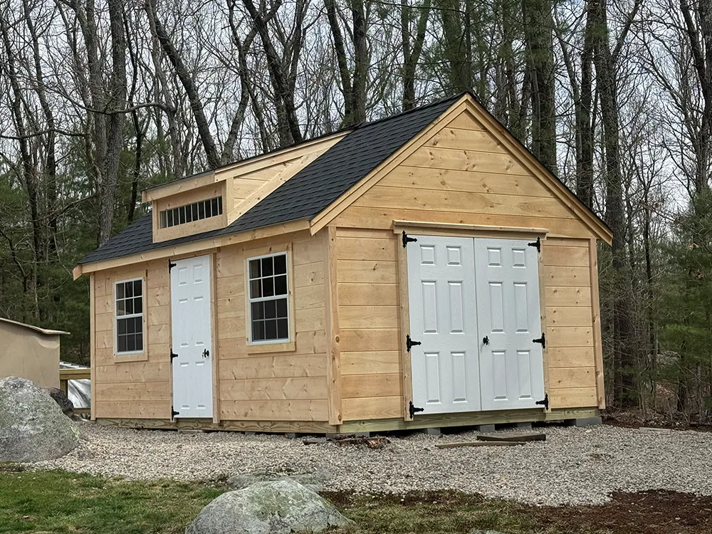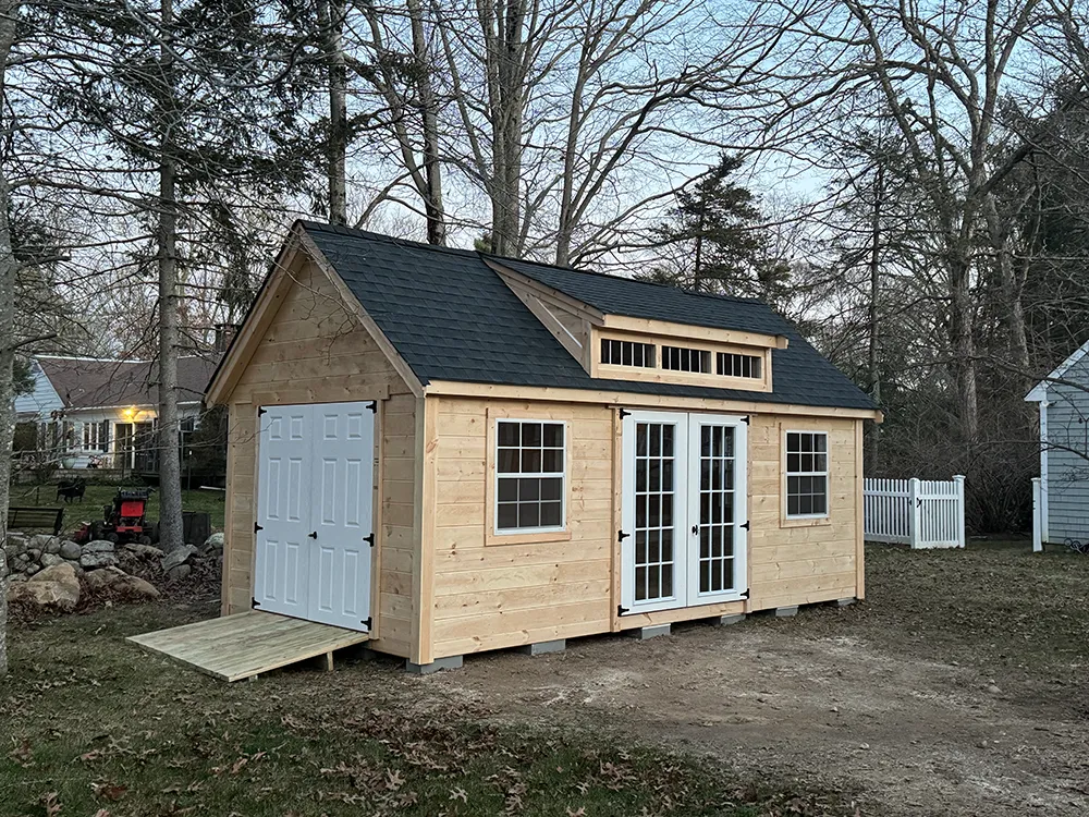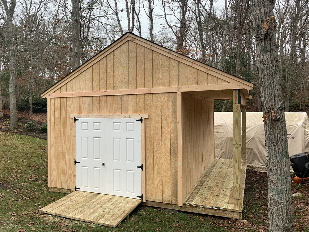 Custom Sheds 2x16 T1-11 with 8 ft sidewalls and 4x8 pressure treated porch 10x14 Hip valley roof 8 x10 ( vinyl) 7 pitch shed with trex porch 8 x10 ( vinyl) 7 pitch shed with trex porch 6 pitch clapboard 12 pitch shed shown with optional patio door and garage door. seven pitch roof 6 pitch shed shown with 8 inch overhang on gable ends.